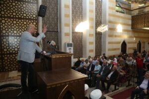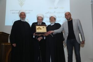 بعدها قدم الشيخ البغدادي درع تكريمي للشيخ القاضي الدكتور يوسف عمرو تقديرا لجهوده العلمية والإجتماعية .