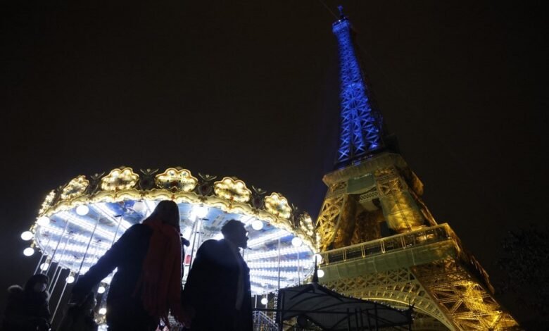 Pedestrians walk past the Eiffel Tower lit in the colours of the Ukrainian flag in a show of support to Ukraine, one year after Russia launched a military invasion on the country, in Paris on February 23, 2023. - Kyiv is set on February 24 to mark the first anniversary of Moscow's invasion, as Ukrainians braced for possible new Russian strikes after a year of defiance and grief, as a year ago, Russia's President stunned the world by sending troops across the border in the early hours of the morning to "de-militarise" Ukraine, in a move seen as punishment for Kyiv's pivot to the West. (Photo by Ludovic MARIN / AFP)