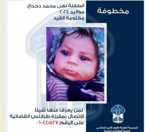 صــدر عــــن المديريّـة العـامّـة لقــوى الأمــن الـدّاخلي ـ شعبة العـلاقـات العـامّـة البــــــلاغ التّالــــــي: “تُعمّم المديريّة العامّة لقوى الأمن الدّاخلي، بناءً على إشارة القضاء المختص، صورة الطّفلة الرضيعة: نهى محمد دحداح (من مواليد عام 2024، مكتومة القيد)، التي اختُطِفَت من والدتها بتاريخ 20-5-2024 بطريقة احتياليّة من قبِل مجهولين، خلال قيامها بالتّسوّل في محلّة العبدة (التّحقيق جارٍ بالحادثة).