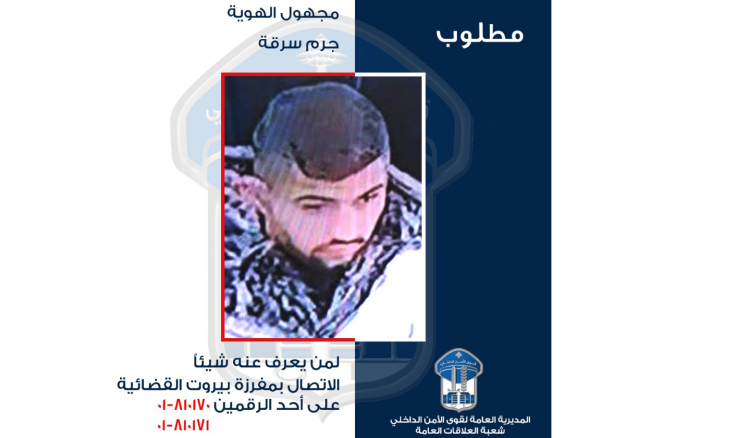 صدر عن المديرية العامة لقوى الأمن الداخلي ـ شعبة العلاقات العامة البلاغ التالي: “تُعمّم المديرية العامة لقوى الأمن الداخلي بناءً على إشارة القضاء المختص، صورة مطلوب مجهول الهوية أقدم على السرقة من داخل أحد المتاجر التجارية.