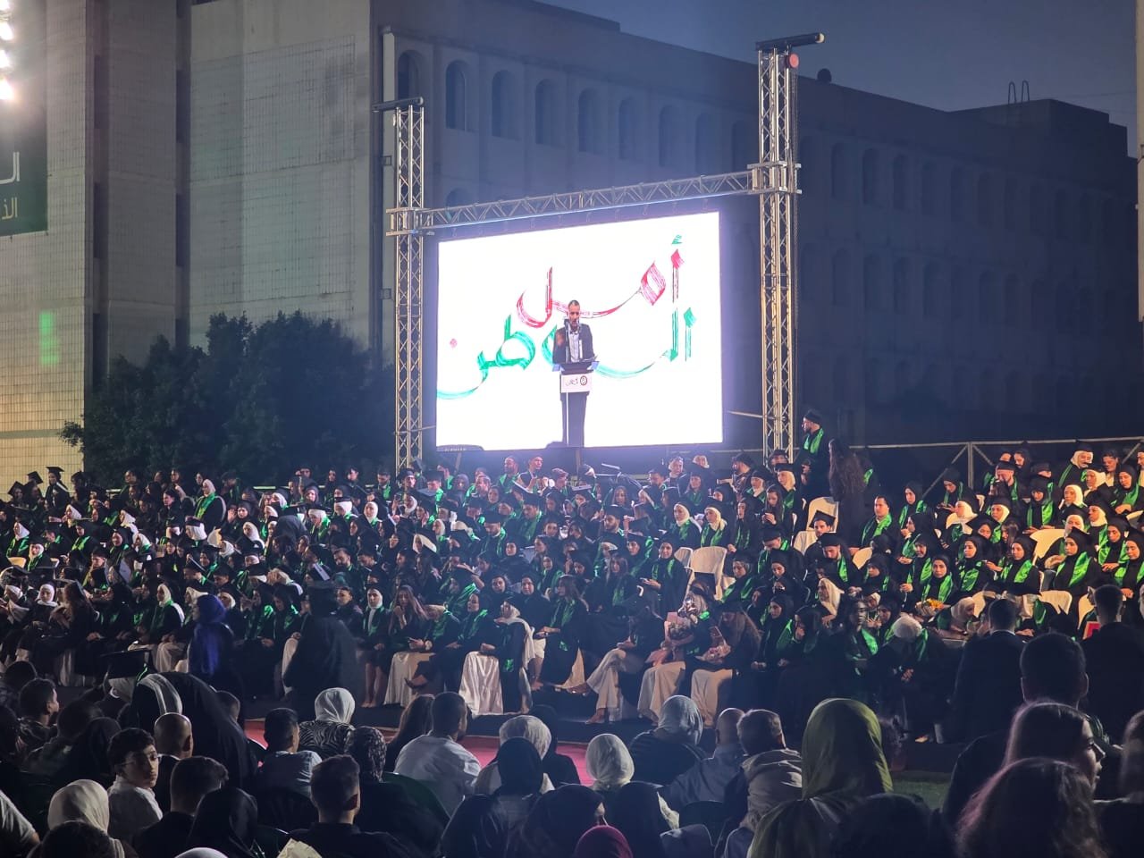حيث استهل كلمته بالقول: “أمـل، أيُّ أفقٍ يخرجُ من تحتِ جُرحِ السماء؟ أمل بالوطن والوطن أملٌ لا يخبو. وأيُّ جناحٍ يرفرفُ، والحديدُ يُطوّقُ الجهات؟ طلابٌ يمشونَ في المدى، يحملون كتباً من رمادٍ، وأقلاماً اغتسلتْ بالدمعِ والنار، ويكتبون أسماءهم على صخورٍ لم تُقْهِرْها قذائفُ الغياب. ما العجبُ إذا وُلدوا من العاصفة؟ ما العجبُ إذا صارت شهاداتهم أجنحةً تُطارد دخان الطائرات؟”.