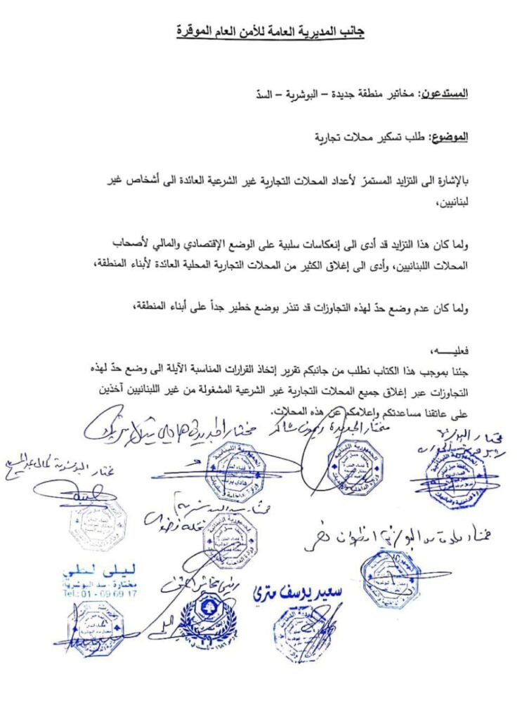 وجه مخاتير منطقة الجديدة، البوشرية، السد، كتابًا إلى المديرية العامة للأمن العام اليوم الجمعة، طالبين فيه إقفال كل المحلات التجارية غير الشرعية المشغولة من غير اللبنانيين..