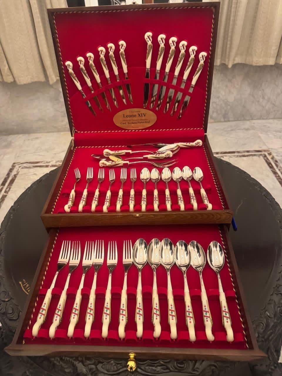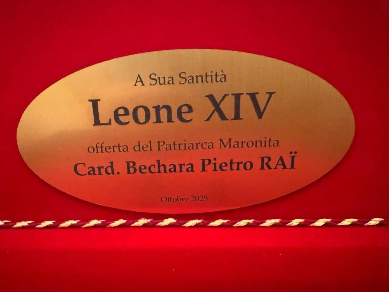 وقدم الراعي للبابا درع البطريركية المارونية وهدية من لبنان عبارة عن صندوق من خشب الأرز وفيه من منتوج جزين طقم السفرة الكامل المزخزف بالعلم اللبناني وقد حفر على الصندوق باللغة الإيطالية ما معناه: ” يُقدم إلى قداسة البابا لاون الرابع عشر من الكاردينال مار بشارة بطرس الراعي، تشرين الأول/ أكتوبر 2025″.