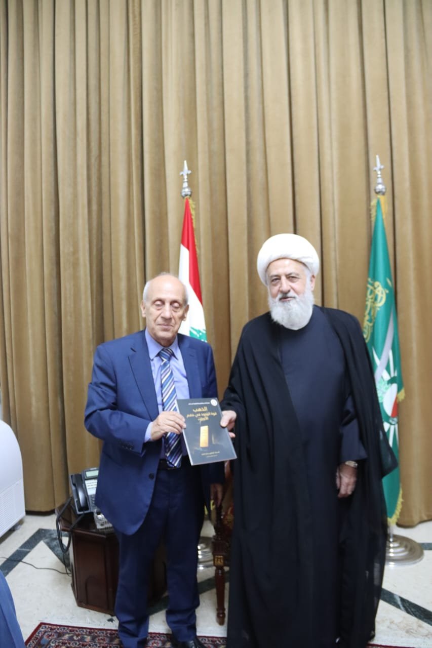 كما، وقدم البروفيسور حجار لسماحته نسخة من كتابة الجديد بعنوان الذهب قوة الوجود في خضم الازمات.