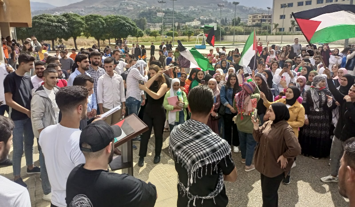 والقيت كلمات للطالبين ميمونة عبيد وعبدالرحمن الزين ولمدير فرع الجامعة خلدون ايوب وجه فيها “تحية اعتزاز وفخر لرجال المقاومة في فلسطين الذبن يسطرون اروع الملاحم البطولية ضد العدو الصهيويني”، معتبرا أن “هذه المعركة كسرت مقولة الجيش الذي لا يقهر والحمد لله الذي وصل هذا اليوم رأينا فيه مئات الأسرى والاف القتلى والمصابين للعدو”. وقال:طاننا ننتظر اليوم الذي سنرى فيه الاسرى المحررين من سجون الاحتلال”.