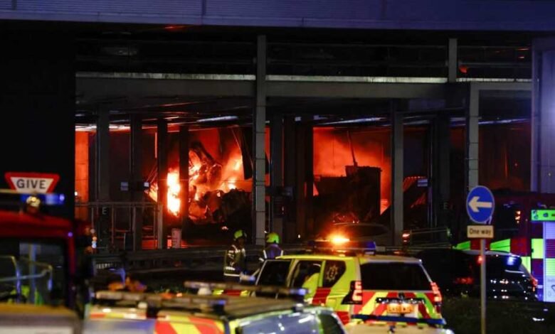 واندلع الحريق قرابة الساعة 21,00 في موقف للسيارات بني مؤخراً في المطار الذي يخدم شركات منخفضة التكلفة.