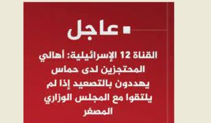 افادت وكالة “روسيا اليوم”، نقلا عن “القناة 12” العبرية اليوم السبت بأن أهالي الإسرائيليين المحتجزين لدى “حماس” في قطاع غزة يهددون بالتصعيد إذا لم يلتقوا مع المجلس الوزاري المصغر.
