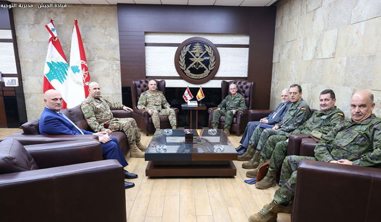استقبل قائد الجيش العماد جوزاف عون، في مكتبه، في اليرزة، رئيس أركان الدفاع الإسباني الجنرال تيودورو لوبير كالديرون، مع وفد مرافق، بحضور السفير الإسباني خسوس سانتوس أغوادو، والملحق العسكري العقيد خوسي لويس جيمينيز غاروفانو.