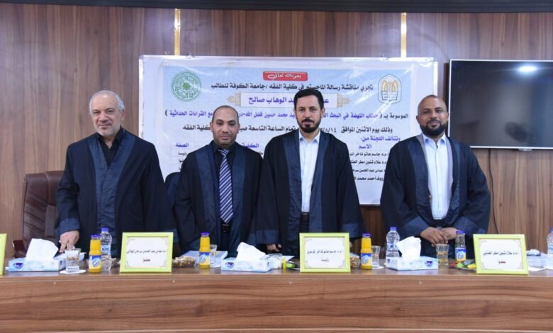 جرت في قاعة كليَّة الفقه في جامعة الكوفة، المناقشة العلنيَّة لطالب الماجستير (عزّالدّين عبد الوهَّاب صالح) في رسالته الموسومة بـ”خطاب النَّهضة في البحث القرآني عند السيِّد محمَّد حسين فضل الله – دراسة مقارنة مع القراءات الحداثيّة.