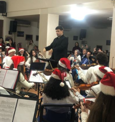 اضاف:”في أجواء راقية من الموسيقى، عزف فيها الطلاب مقطوعات من الموسيقى الكلاسيكية ببراعة وإتقان، فاستطاعوا أن يبثوا أجواء من الفرح، زيّنتها قبعاتهم الميلادية بالأحمر والأبيض، وشغفهم المكلل ببراءة أطفال يبثون الأمل بغد مشرق، عبر عزفهم ورقيّ آلاتهم الوترية وهم يتبعون بأناقة والتزام عصا القيادة.