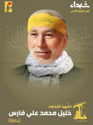 “بمزيد من الفخر والإعتزاز، تزف المقاومة الإسلامية الشهيد المجاهد خليل محمد علي فارس “حمزة” مواليد عام 1969 من بلدة عيترون في جنوب لبنان وسكان بلدة جدرا في جبل لبنان، والذي ارتقى شهيداً على طريق القدس”.