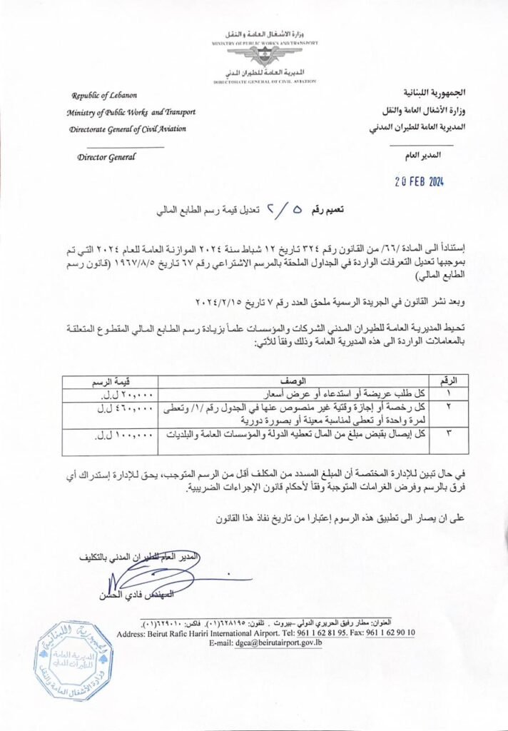 أصدر المدير العام للطيران المدني بالتكليف المهندس فادي الحسن تعميما حمل الرقم 2/5 يقضي بتعديل قيمة رسم الطابع المالي.