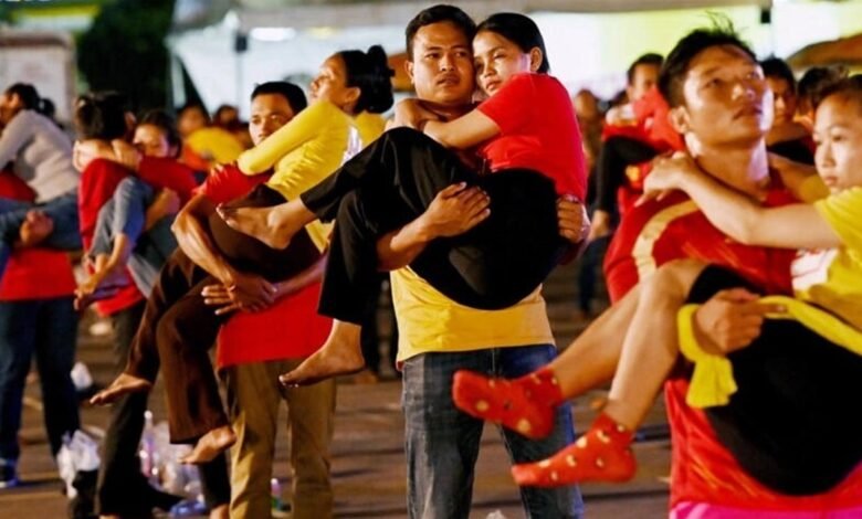 بالرغم من الحرارة الاستوائية اللزجة، تحدى المئات من الكمبوديين الطقس ليحققوا رقما قياسيا عالميا جديدا لأكبر عدد من الأشخاص الذين يقومون “بحمل الزوجات” في الوقت نفسه.