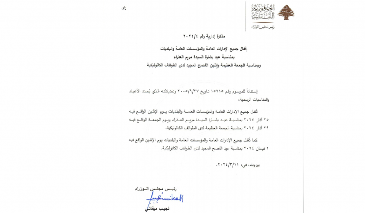 “استنادا للمرسوم رقم 15215 تاريخ 2005/9/27 وتعديلاته الذي يحدد الاعياد والمناسبات الرسمية ، تقفل جميع الادارات العامة والمؤسسات العامة والبلديات يوم الاثنين الواقع فيه 25 آذار 2024 بمناسبة عيد بشارة السيدة مريم العذراء ويوم الجمعة الواقع فيه 29 آذىر 2024 بمناسبة الجمعة العظيمة لدى الطوائف الكاثوليكية.