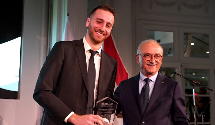 عرقجي: وكانت كلمات للمكرّمين بـ “جائزة سارة هانتغتون سميث” التي تمنحها الجامعة حيث تحدث النجم الرياضي وائل عرقجي (خريج LAU) والذي تسلم الجائزة باسم منتخب لبنان في كرة السلة عن سعادته بالتكريم من الجامعة التي تعلم فيها دروساً قيّمة في الحياة، اضافة الى تجربته حيث امضى ساعات طويلة في التدريب، معتبراً ان “الالتزام هو السبيل الى النجاح”.
