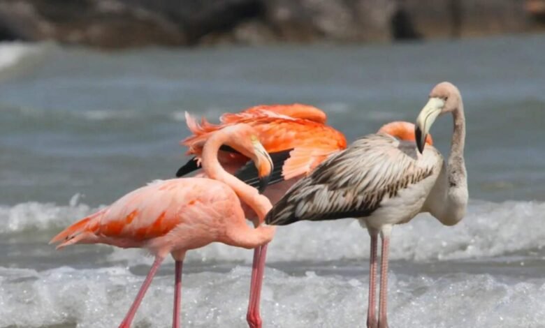 رصد روّاد شاطئ ميشيغان في ولاية ويسكونسن الأميركية، يوم الجمعة، 5 من الطيور الاستوائية ذات اللون الوردي، المعروفة بالفلامنغو، وهي تمرح قبالة الشاطئ في مياه بحيرة.