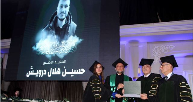 وتخلل الحفل تكريم خاص من الجامعة لذكرى خريجها الشهيد الدكتور حسين هلال درويش الذي استشهد على الحدود اللبنانية، وذلك بمنحه شهادة فخرية اعتزازاً بـ”الطبيب الشهيد وبمساره الأكاديمي والإنساني” تسلّمها والده.